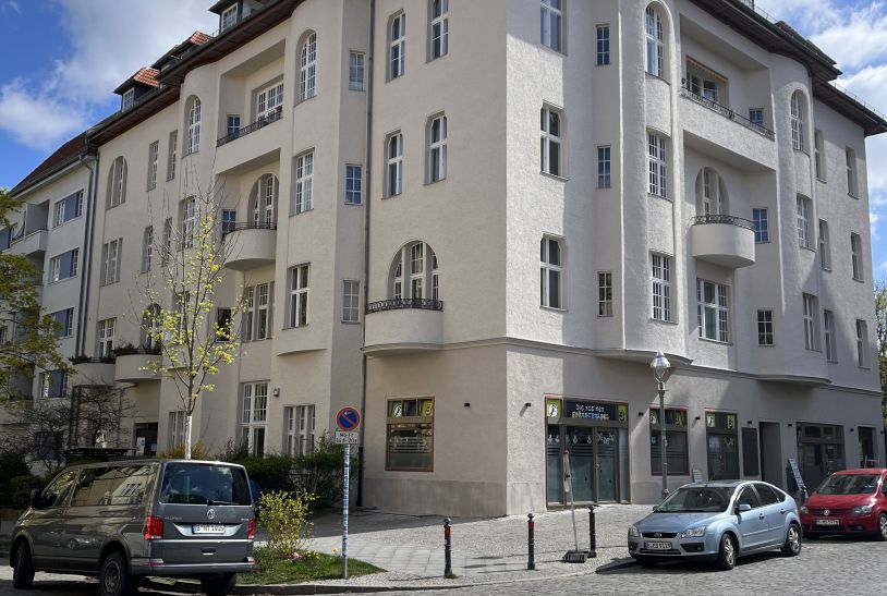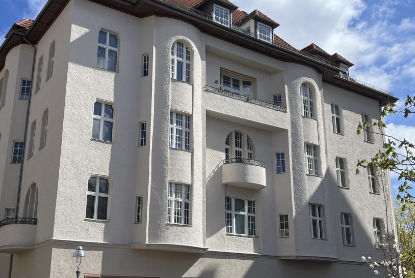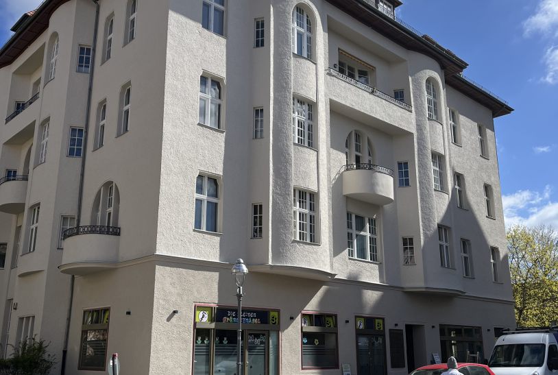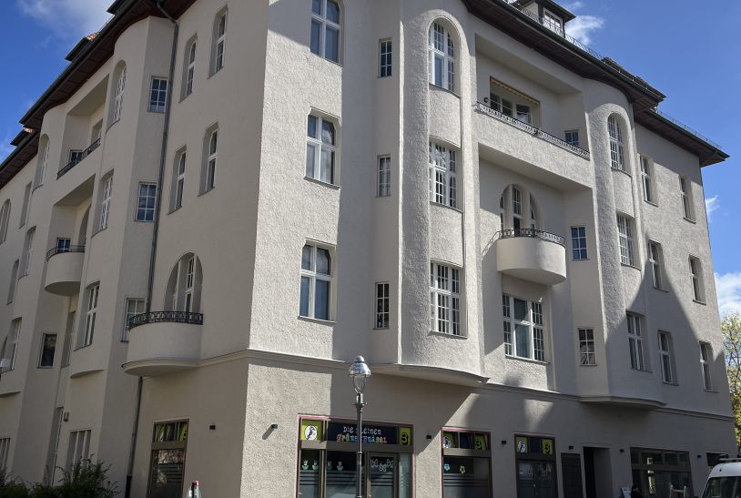 Eine typische Alt-Berliner Fassade, die in Teilen unter Denkmalsschutz steht. Die einzelnen Bauteile wie Dachkasten, Kratzputzfassade, Fenster und Türen wurden behutsam überarbeitet und gemäß den Auflagen der freigelegten Beprobungen, strukturell und farblich hergestellt.